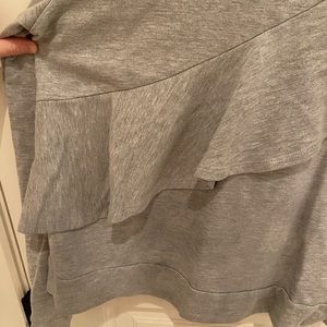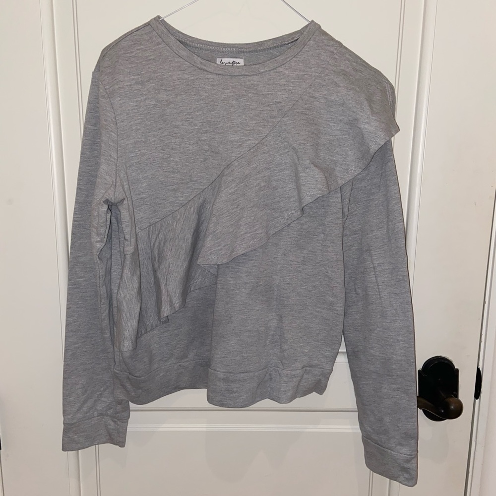 Super comfy gray sweater with a ruffle across the front! NEVER WORN! It’s a light gray color throughout. It’s super comfy and great for colder days.