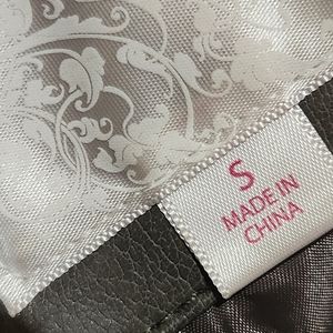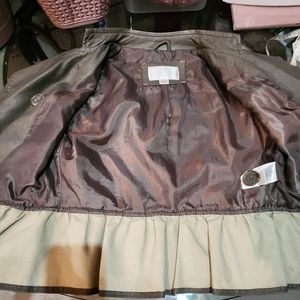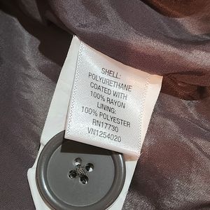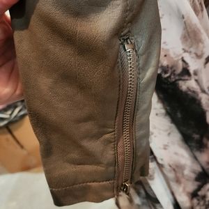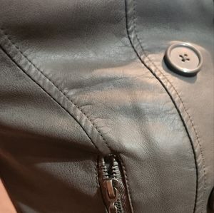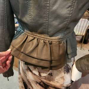 Very good condition, faux leather jacket in gray. Zippers on sleeves & pockets. Fits true to size. Button up front. Darling ruffles on the bottom of the jacket. It's also the perfect gray color. Cute!