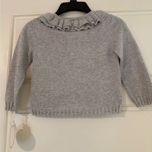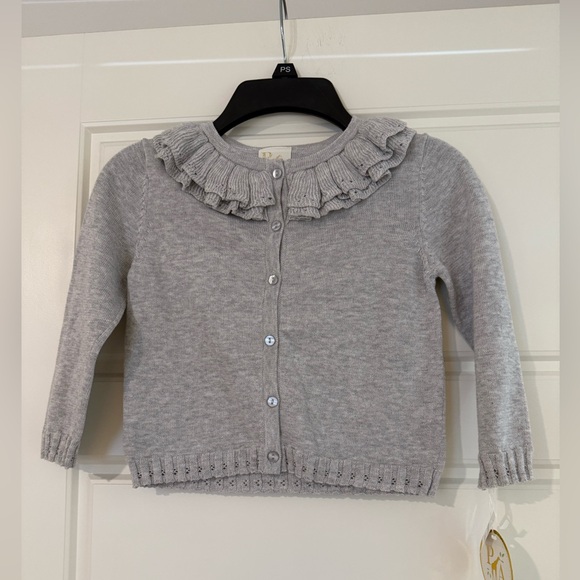 Chic gray cardigan with ruffled collar and button-up front. Perfect for layering.