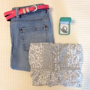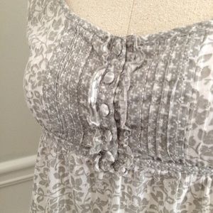Sweet and romantic ruffles! I originally bought this gray flowered top because it has a very Anthro or J.Crew vibe- the brand is Aeropostale. Ties in the back, little buttons on the front, flattering bustline.