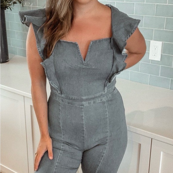 Stylish gray jumpsuit with elegant ruffle details. Perfect for any occasion.