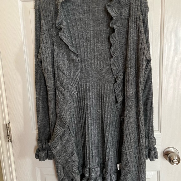 Stylish gray knit cardigan. Features elegant ruffles. Perfect for layering.
