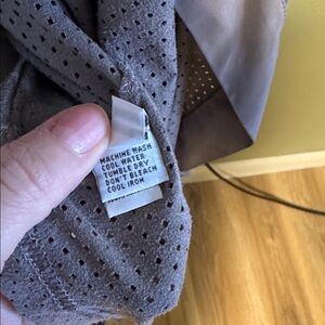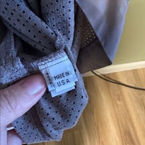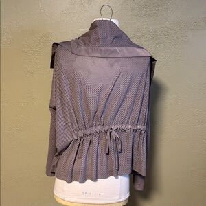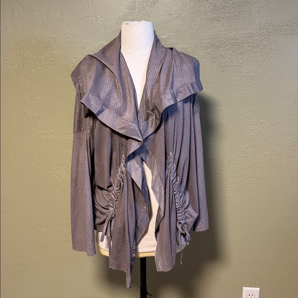 Stylish gray cardigan with ruffled open front design. Perfect for layering. Open hole mesh pseudo-suede fabric. 100% microfiber. Gray layering piece.