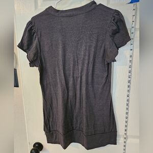 Elegant gray short sleeve women's top with stylish ruffle detailing. Perfect for any occasion. From a smoke free home.