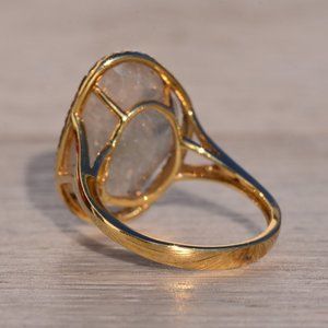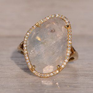 The Merced River: Gray Sapphire and Natural Diamond Halo Ring. This exquisite ring showcases a stunning 9.48 carat central free-formed cut natural gray sapphire, adding an air of uniqueness and sophistication to the piece. Surrounding the captivating center stone is a halo of round-cut natural diamonds, totaling 0.15 carats by measurement, which accentuate the sapphire's beauty and add a touch of sparkle. Meticulously crafted in 14 karat yellow gold, the ring radiates warmth and elegance. Currently sized at 6.5, it offers the option for personalized adjustment to any finger size, with an additional charge applicable upon request.