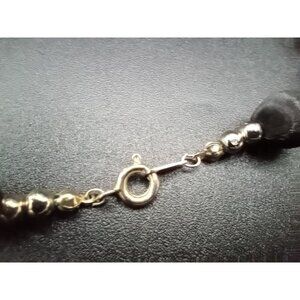 This elegant vintage necklace crafted from gray satin silk thread, adorned with delicate beads, was made in Korea in the 1980s. This 29-inch fashion jewelry piece adds a touch of sophistication to any ensemble and is perfect for vintage jewelry lovers and collectors.