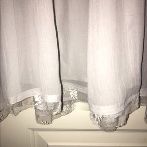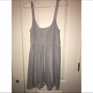 Flowy light gray dress. Fitted at waist, scoop neck with ribbon-like sleeves. Lace design on chest and at bottom, as pictured. Never been worn