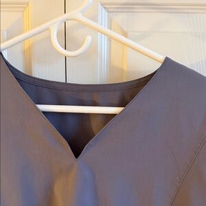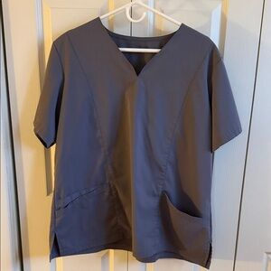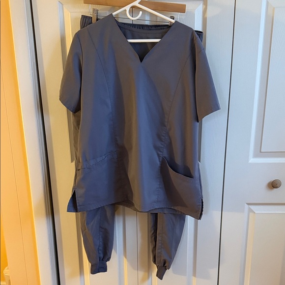 Comfortable gray scrub set with top and pants. Ideal for healthcare professionals.