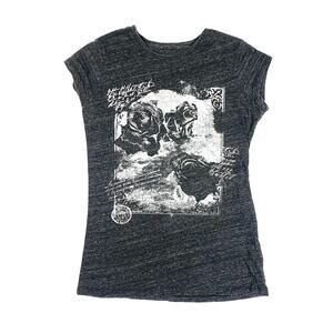 Mudd juniors gray heathered fitted tee shirt with white graphic print, short sleeves, has stretch, displayed on women’s size medium (8-10) dress form, gently worn overall good condition