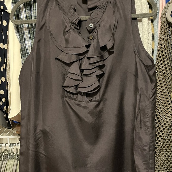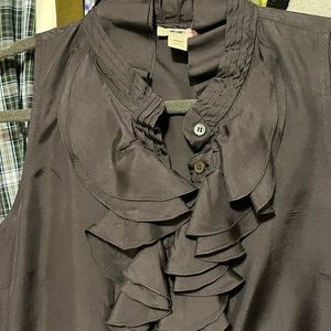 100% silk ruffle top in deep gray. Will arrive dry cleaned and professionally pressed! In excellent condition.