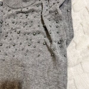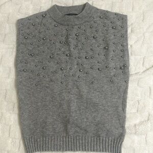 Stylish gray sleeveless sweater featuring a unique beaded design. Perfect for layering.