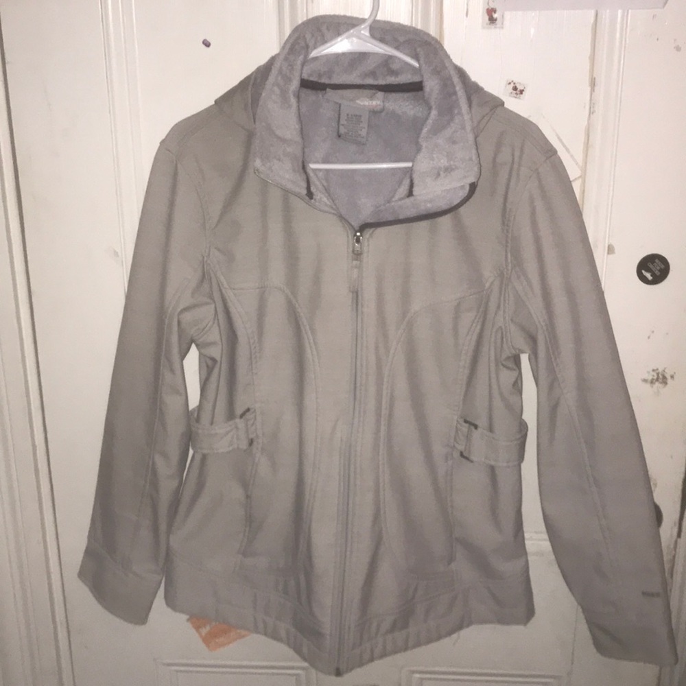 This jacket is great for fall/spring. It has a fleece lining and a hood to keep warm with.