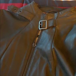 100% Genuine Leather Jacket perfect for the spring or a cool day. Leather has 2 front zipper pockets, a zipper by the wrist on each arm and metal buckle in the neck area. Leather zips up perfectly fine as you can see in the picture however it is missing the zipper handle