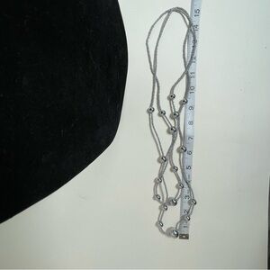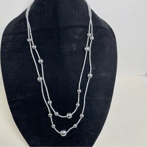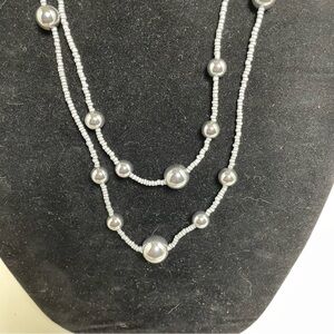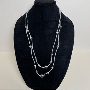 This elegant necklace features a double strand of small gray stone beads with silver tone ball accents. Excellent preowned condition. Approx 16” drop for longer strand.