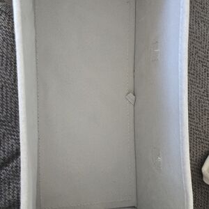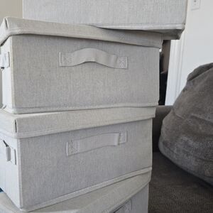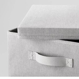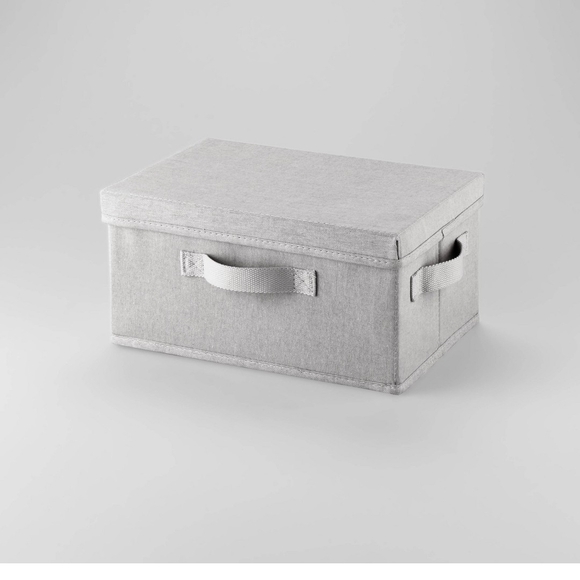 Stylish gray storage box with convenient handles. Perfect for organizing.