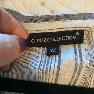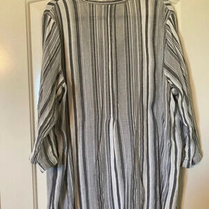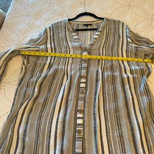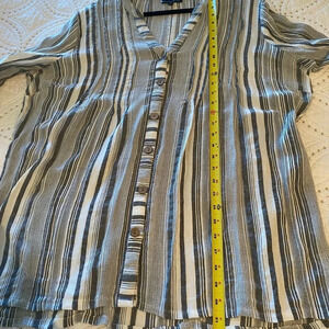 Gray stripe button up/ Vneck “linen look” shirt. Dimensions in pictures. Pet and smoke free home.