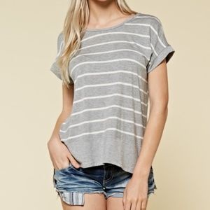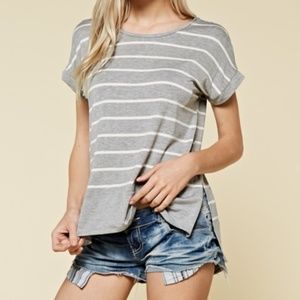 Gray with white stripes drop-shoulder short cuff sleeve tee. High-Low Hem with side slits. Comfy and cute!