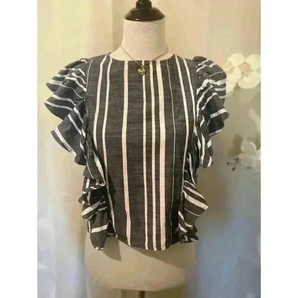 Gray Striped Ruffle Blouse