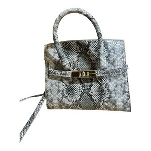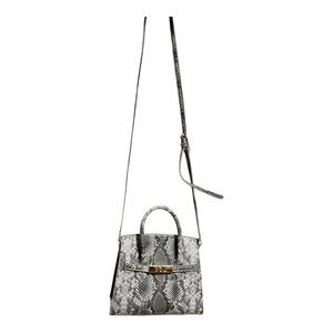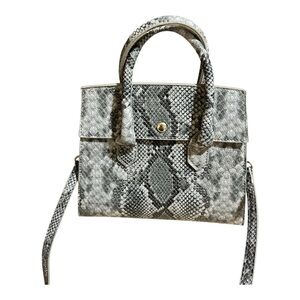 This satchel features a striking faux snakeskin texture in elegant gray tones, offering a sophisticated and exotic look. Its structured silhouette and rigid top handles make it a standout accessory for any occasion. The bag's design is completed with a stylish strap detail, adding to its luxurious appeal.