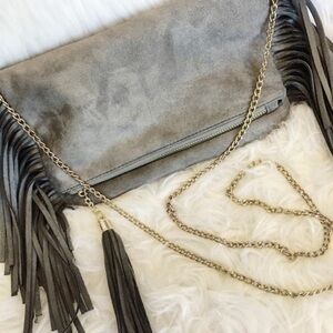 Gray suede bag, could be worn as a clutch, on the shoulder or cross body. Could be worn on all occasions, dressed up or down.