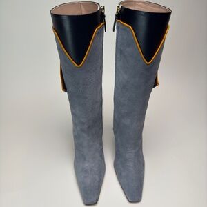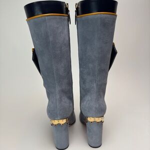 Women's Gray suede calf-high boots. Made in Italy and from Italian leather, these boots are Very chic, which can be dressed up or worn casually. They are made with a 105 mm (~4 inches) block heel for added comfort. These boots have a unique golden crown on each heel and adorned with real Swarovski crystals. They are brand new and come with the original box, dust bags and 2 top lifts/Piece (heel cap).