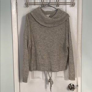 Gray sweater with wide cowl neck and adjustable drawstring tie at the bottom. Light material for comfortable wear
