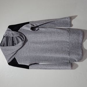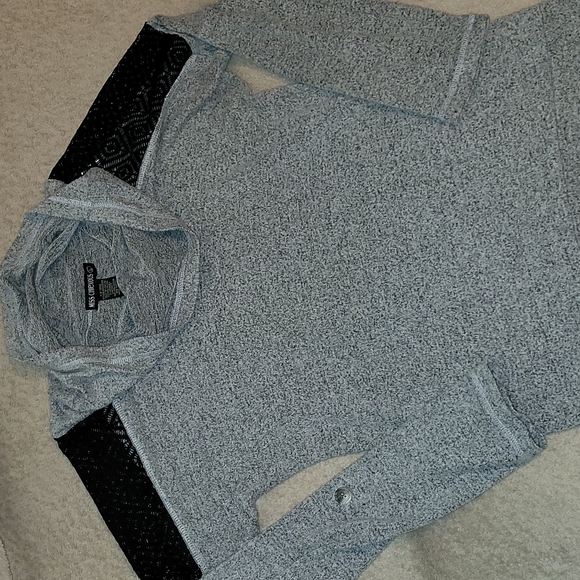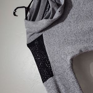 Grey, loose neck sweater with black lace see through shoulders. The sleeves button up for quarter sleeves.