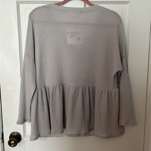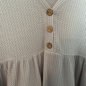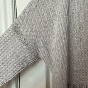 Adorable gray sweater, thin material perfect for the spring/fall or a cool summer night. Has a slight purple(lavender) tint to the gray. The three buttons are like a distressed wood look.
