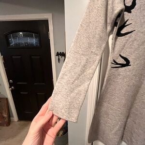 Gray Sweater Dress with Black Bird Pattern and Red Collar