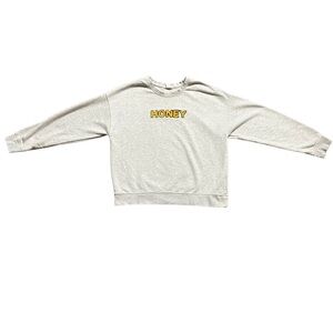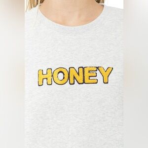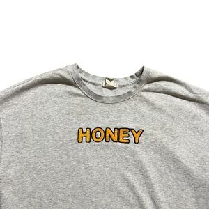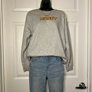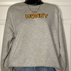 Sweet, simple, and stylish! This gray crewneck sweatshirt features the word HONEY in bold yellow lettering across the front – perfect for adding a pop of personality to your cozy-day wardrobe.