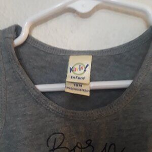 Gray tank top with fringe hem. Features 'Born Free but now I'm expensive' text and sequin design in red, white, and blue.