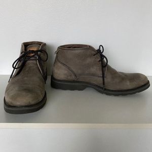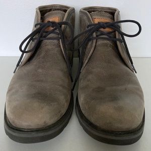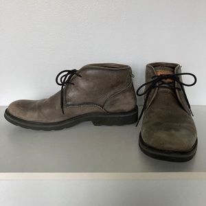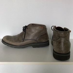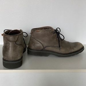 These boots are from Pikolinos Light line. Very soft and supple leather lace-up ankle boots with cushioned removable insole. These have a distressed look and show some wear most notably on the top foot toe area. Color looks like a grayish brown taupe color to me.