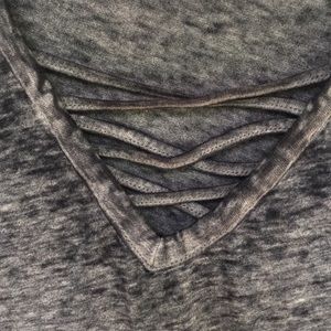 Gray pepper tee with cross cross detailing in the front. great condition.