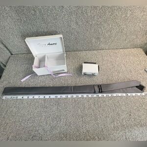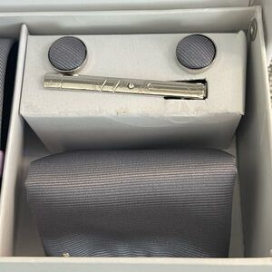 This refined accessory set features a sleek gray tie, perfect for adding a touch of sophistication to any formal ensemble. Accompanied by a matching tie clip and cufflinks, each piece is meticulously arranged in a compartmentalized box for effortless organization. The dark gray lining of the box enhances the overall elegance, making it an ideal choice for special occasions.