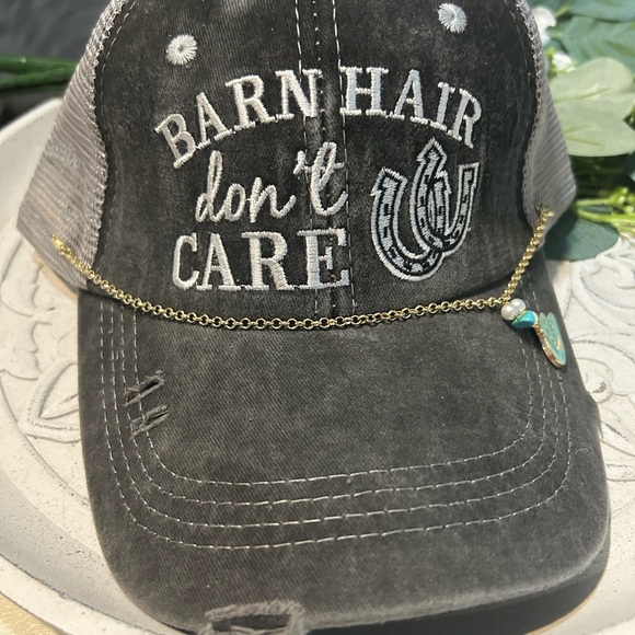Stylish gray trucker hat featuring a unique chain accent and embroidered design. Perfect for casual wear.
