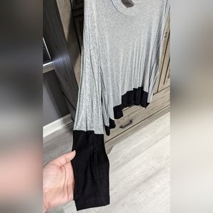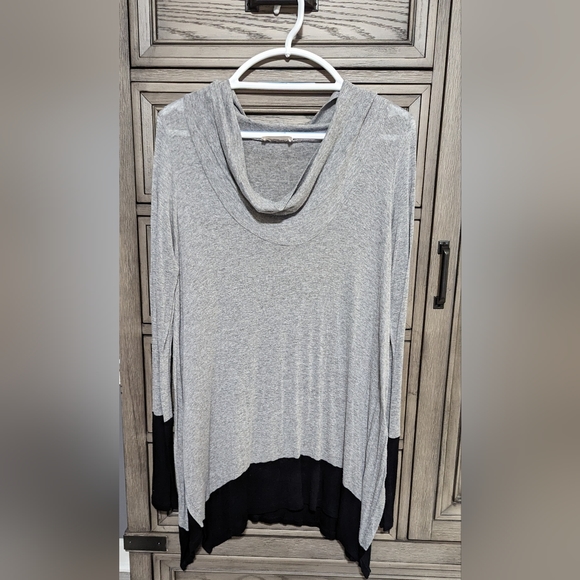Gray Tunic has black trim at wrist and bottom. Cowl neck. Light weight. Looks great with black leggings and boots.