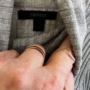 Stay cozy and stylish with this gray ribbed turtleneck sweater. Perfect for layering or wearing on its own. This vintage sweater is from Express. This item is made from 33% nylon, 25% merino wool, 14% polyester, 12% rayon, 7% metallic, 6% silk and 2% spandex. The size is medium. The measurements are 23” L x 16” W (pit to pit) x 26” sleeve (shoulder to cuff). This sweater has been gently worn but is in excellent condition.