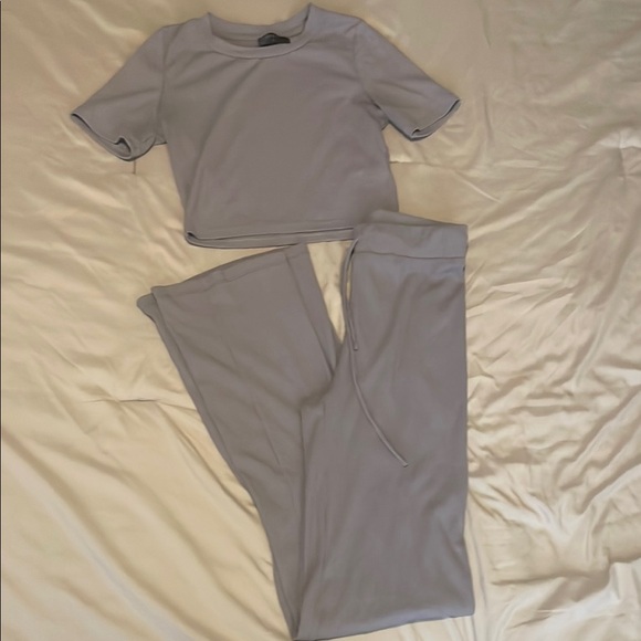 Comfortable gray two-piece lounge set from White Fox Boutique. Includes a short-sleeve top and matching pants.