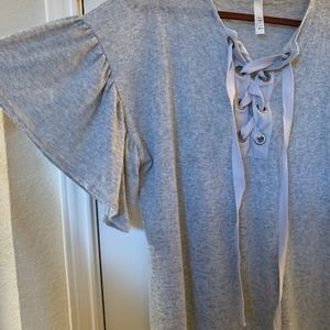 Gray Umgee lace-up blouse. Slightly sheer. Umgee runs large, so this blouse is very loose fitting. It's only been worn twice. I love it, but it's just a little too big for me.