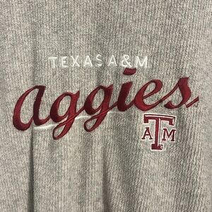 This light gray V-neck sweater offers a relaxed fit, perfect for casual wear. Featuring a bold 'Aggies' print on the front, it combines comfort with a touch of team spirit. Made from a soft cotton blend, it's ideal for layering in cooler weather.