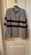 Stylish gray V-neck sweater featuring bold black stripes. Perfect for a cozy and chic look.