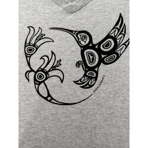 This lightweight and breathable gray V-neck T-shirt features a striking tribal bird design.