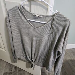 Gray V-Neck Waffle Knit Tie-Front Top