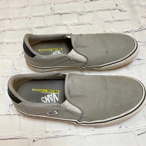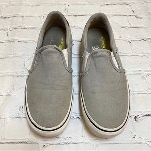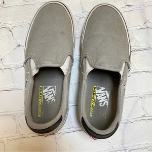 Size men’s 8/women’s 9.5 light gray Vans in good used condition. Some wear on back logos and a minor spot on the canvas. Freshly washed and ready to wear.