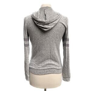 Hippie Rose soft knit gray zip up, has hood and pockets, purple varsity stripes on the sleeves, juniors medium, displayed on size medium (8-10) dress form, has stretch, gently worn overall good preowned condition.