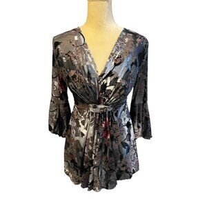 Gray Velvet Burnout Floral Blouse Bell Sleeve Babydoll Size Small Whimsygoth Y2K