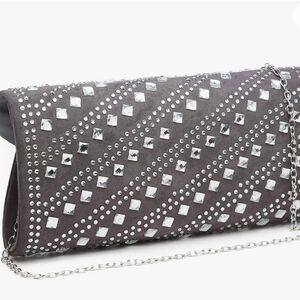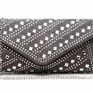 Love this girl! Gray velvet clutch with detachable shoulder strap LOADED with Studded Metal and Rhinestone Details! Magnetic Closure!