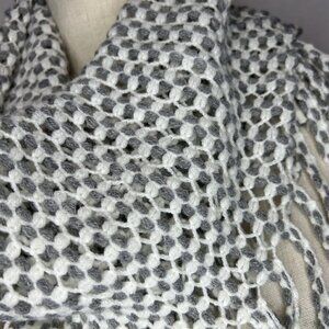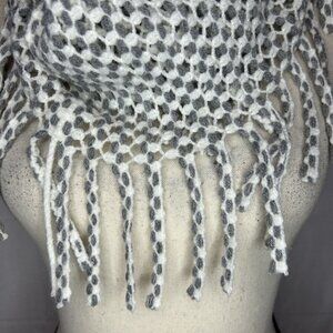 Gray / White Chunky Knit Infinity Scarf with Fringe NWOT, 100% acrylic, very soft. This scarf is design like a tube with openings on each end.