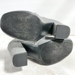 This product is a pair of stylish gray wool 50's Mary Jane style rockabilly pin up high heel pumps in size 7.5. The shoes feature a round toe shape, slip-on closure, and a block heel style. They are adorned with crochet and bow accents, giving them a unique and feminine look. The stylish pump design, wool upper material, and 50's theme make these shoes a perfect choice for women looking to add a touch of retro flair to their outfit.