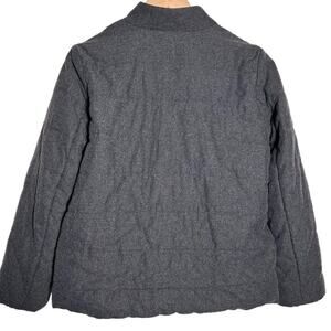 Classic gray wool blend quilted jacket, a versatile and stylish outerwear piece. Features a quilted design for added warmth and comfort, complemented by a button-up front for a secure fit. The jacket's clean lines and minimalist aesthetic make it suitable for a range of occasions, from casual outings to more formal settings. Perfect for adding a touch of understated elegance to your everyday wear or layering over office attire for added warmth.